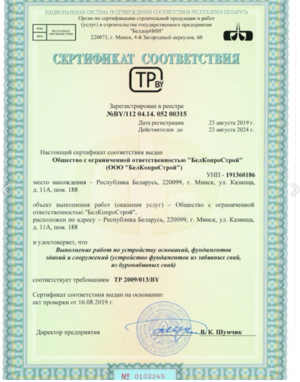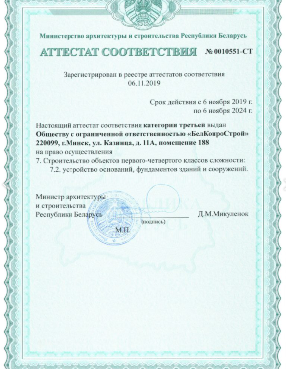 Специализированная строительная группа компаний, основным видом деятельности которой является выполнение работ по устройству свайных фундаментов из забивных и буронабивных свай, а также предоставление в аренду специализированной сваебойной и буровой техники. Предприятие активно работает на рынке строительных услуг Беларуси с 2010г.